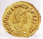Revers eines Tremissis des Romulus Augustulus im Gewicht von 1,46 g Als die Germanenreiche der Völkerwanderungszeit mit diesen spätrömisch-byzantinischen Münzen in Berührung kamen, liessen sie ähnliche Geldstücke für sich ausprägen. Die Qualität lag weit hinter dem Original zurück und sie können nur durch stilistische Merkmale den einzelnen Germanenreichen zugeordnet werden (z.B. West- und Ostgoten, Vandalen oder das Frankenreich unter den Merowingern). Letztere vermerkten gerne Prägeort bzw. Zeichen der Münzmeister auf den Geldstücken. |